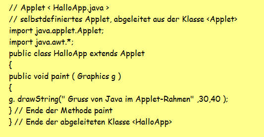 Jetzt deklarieren wir unsere HalloApp Klasse, die alle Eigenschaften und Methoden von Applet erbt.