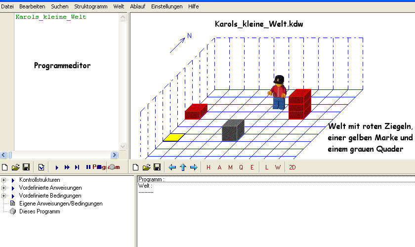 Schreibe dazu ein Programm Karols_kleine_Welt.kdp, wo Karol in der NW-Ecke dieser Welt startet, vom Ziegelstapel 2 Ziegel herunternimmt