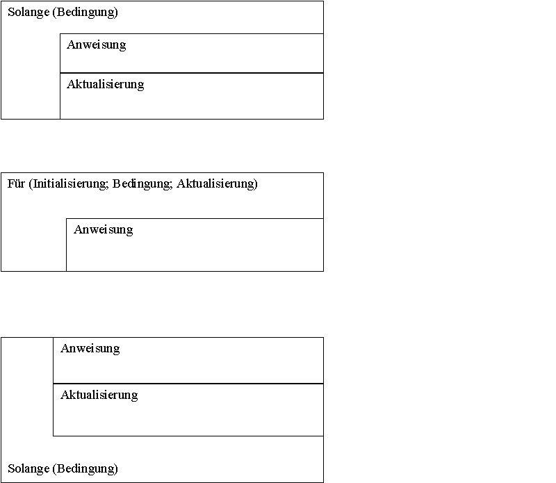 Alle Schleifen haben folgende Komponenten: Initialisierungsanweisung(en): Diese werden nur einmal am Beginn der Schleifenausführung ausgeführt. Die Variablen, denen Werte zugewiesen werden, können innerhalb der Schleife verwendet werden. Logischer Ausdruck: Dieser Ausdruck wird bei jedem Schleifendurchlauf überprüft und bestimmt, ob der Schleifenkörper (erneut) ausgeführt wird. Schleifenkörper: Der Schleifenkörper wird ausgeführt, wenn der logische Ausdruck true ergibt. Gibt dieser Ausdruck false zurück, springt das Programm an die Klammer, die das Schleifenende markiert. Aktualisierung: Verändert (aktualisiert) die Variable(n), die in den Initialisierungsanweisung(en) gesetzt wurden. |